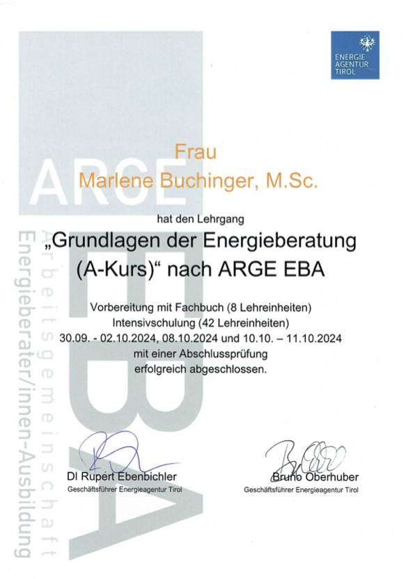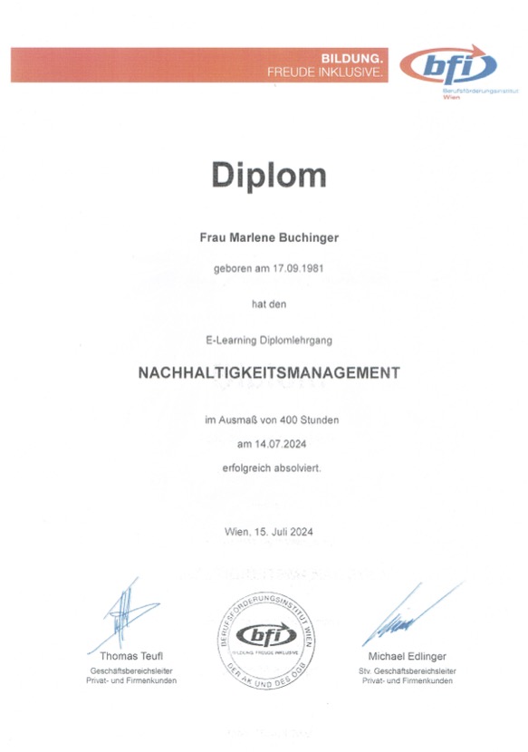 Besonders 2024 stand das Thema Weiterbildung wieder einmal ganz oben auf der Liste. Nach der Teilnahme am UN Global Compact Climate Ambition Accelerator im Jahr 2021 und der Zertifizierung zur CSR-Managerin im Jahr 2022, war es mal wieder Zeit für mich. Im Frühjahr und Sommer 2024 durfte ich den Diplomlehrgang „Nachhaltigkeitsmanagement“ beim BFI Wien online besuchen und erfolgreich abschließen. Und im Herbst stand noch der Grundkurs für Energieberater auf dem Programm. Dazwischen fand noch die erste Tiroler Windenergie Tagung und die Tiroler Energiekonferenz statt, die spannenden Austausch und neue Ideen brachten. Denn die Themen Klimatransformation und Nachhaltigkeit sind umfangreich – es gibt viel zu tun und ein breites Wissensspektrum hilft.